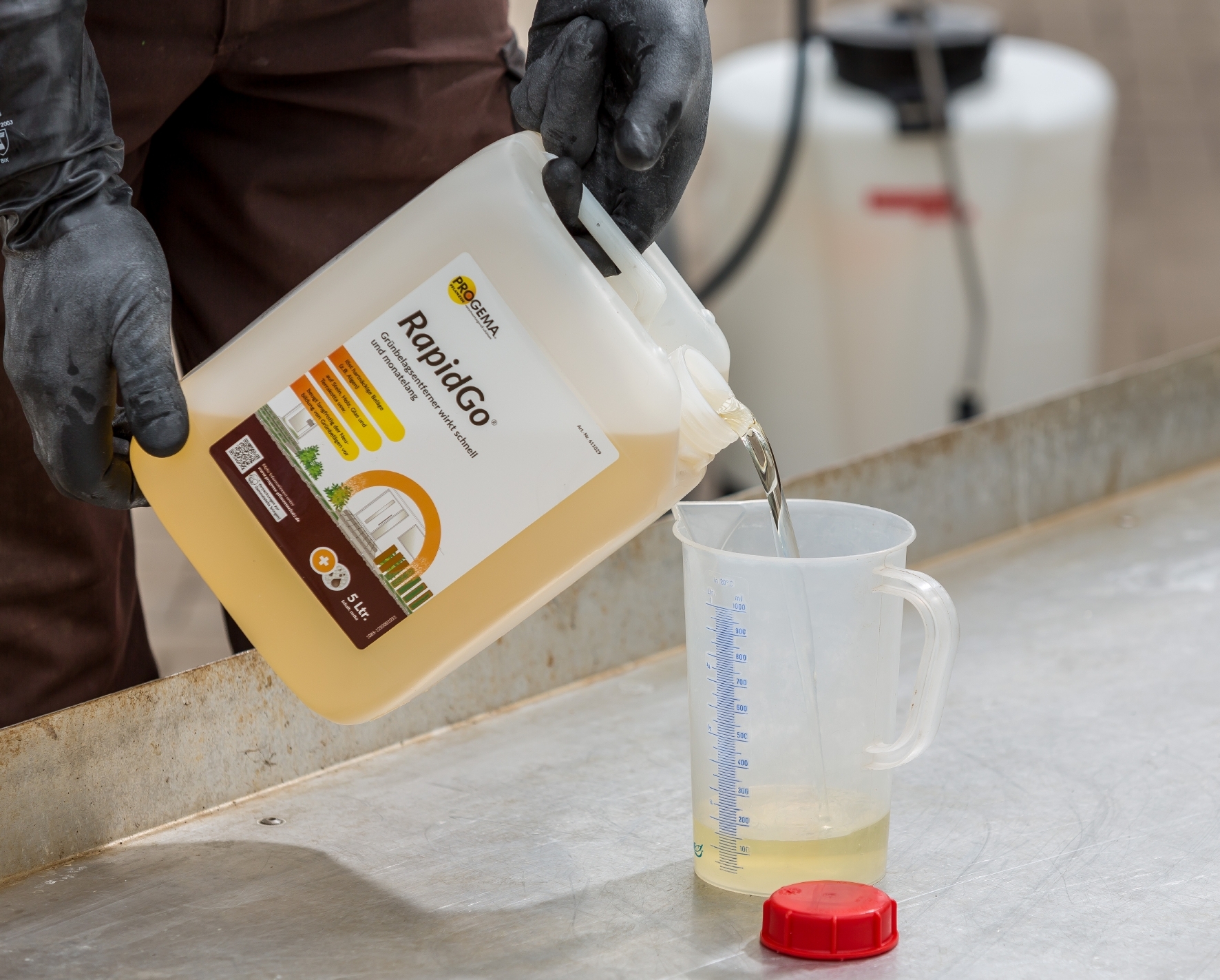 Grünbeläge mit einer Gießkanne mit einer feintropfigen Brause gleich mäßig benetzen. Algen und Grünbeläge sterben nach der Behandlung rasch ab. Nach der Behandlung dicke, abgestorbene Beläge gegebenenfalls abbürsten/abfegen.